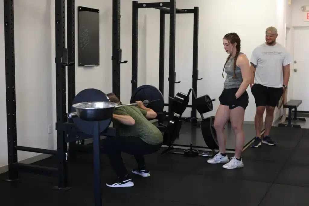 Coach Trinity coaching Marty through some squats